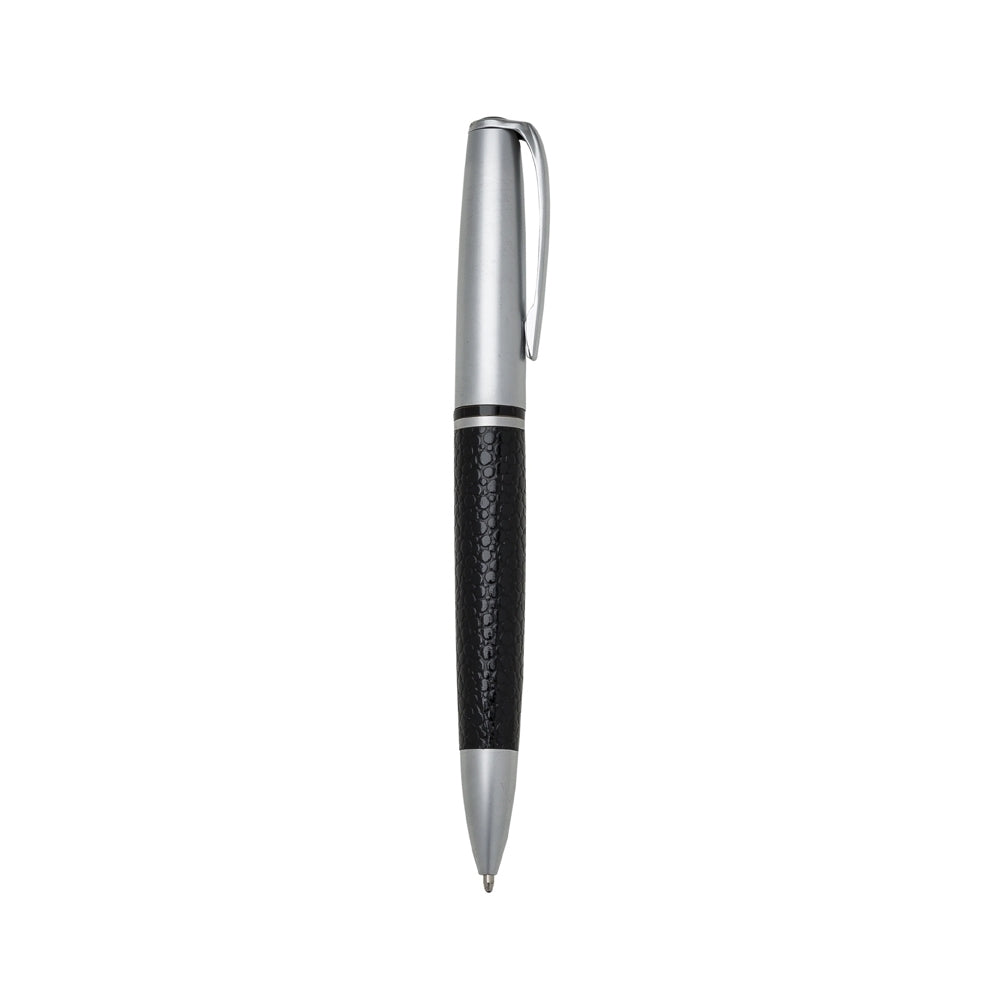 Caneta metálica com detalhe em couro sintético, carga esferográfica azul 1.0 mm e acionamento por rotação.