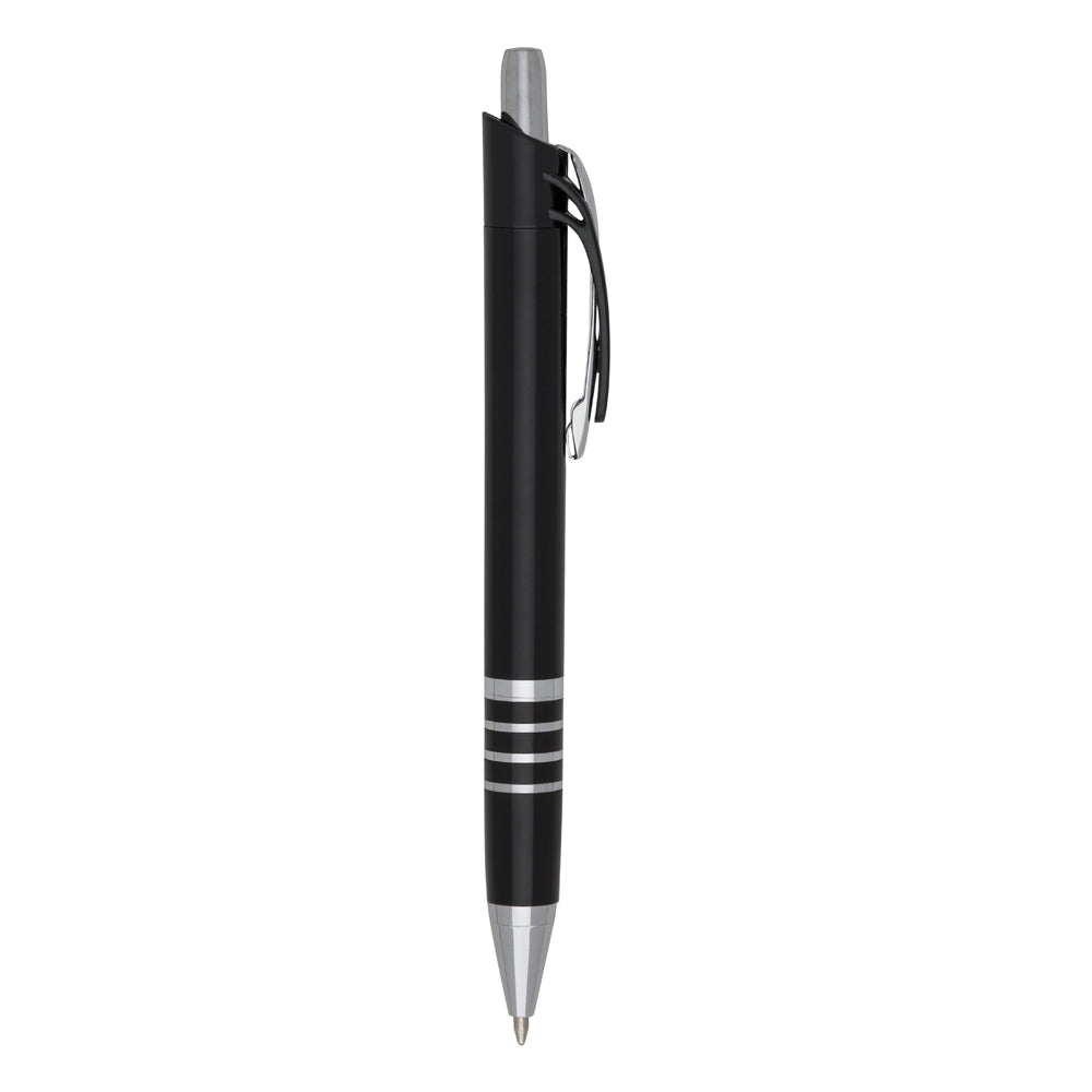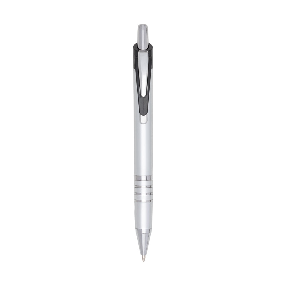 Caneta plástica com carga esferográfica azul 1.0 mm e acionamento por clique.