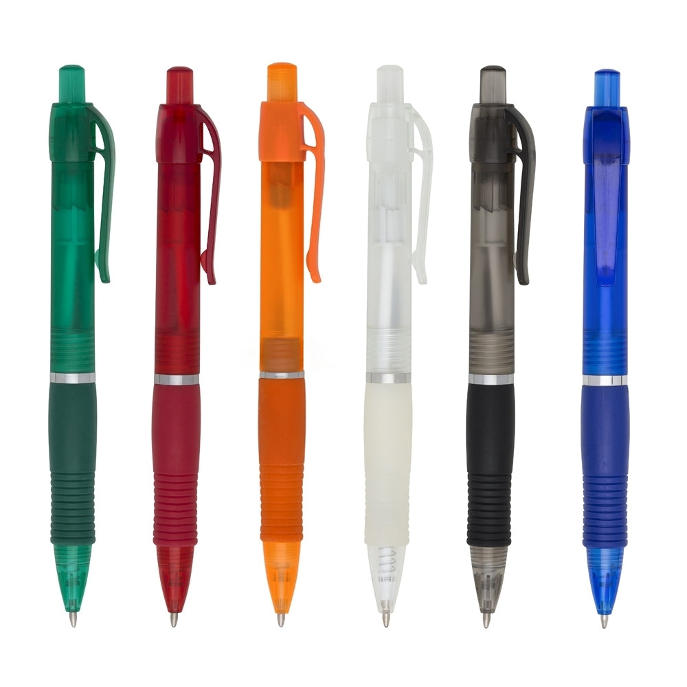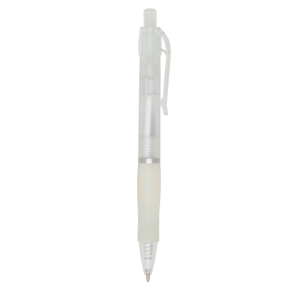 Caneta plástica com detalhe emborrachado, carga esferográfica azul 1.0 mm e acionamento por clique.