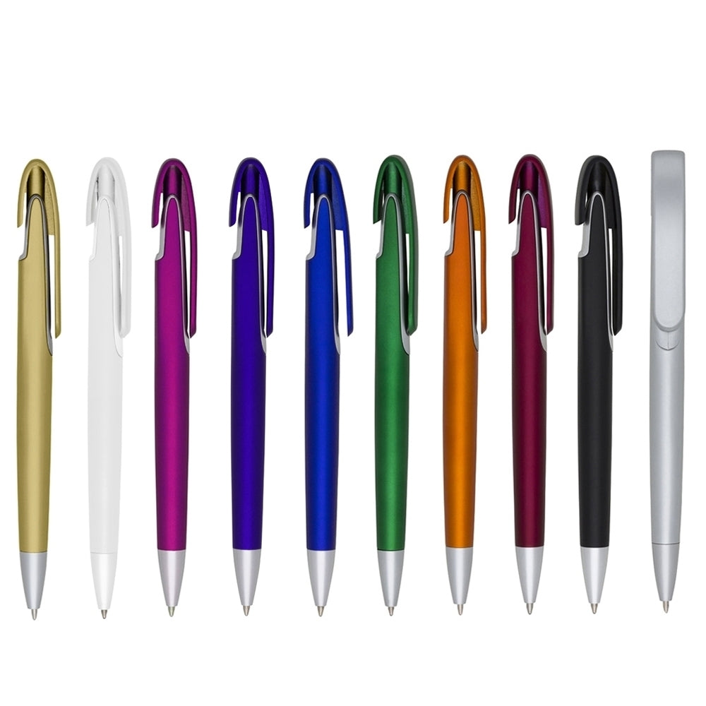 Caneta plástica com carga esferográfica azul 1.0 mm e acionamento por clique.
