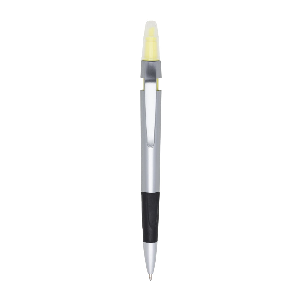 Caneta plástica com marca texto, contém detalhe emborrachado e tampa protetora para o marca texto. Carga esferográfica azul 1.0 mm e acionamento por clique.
