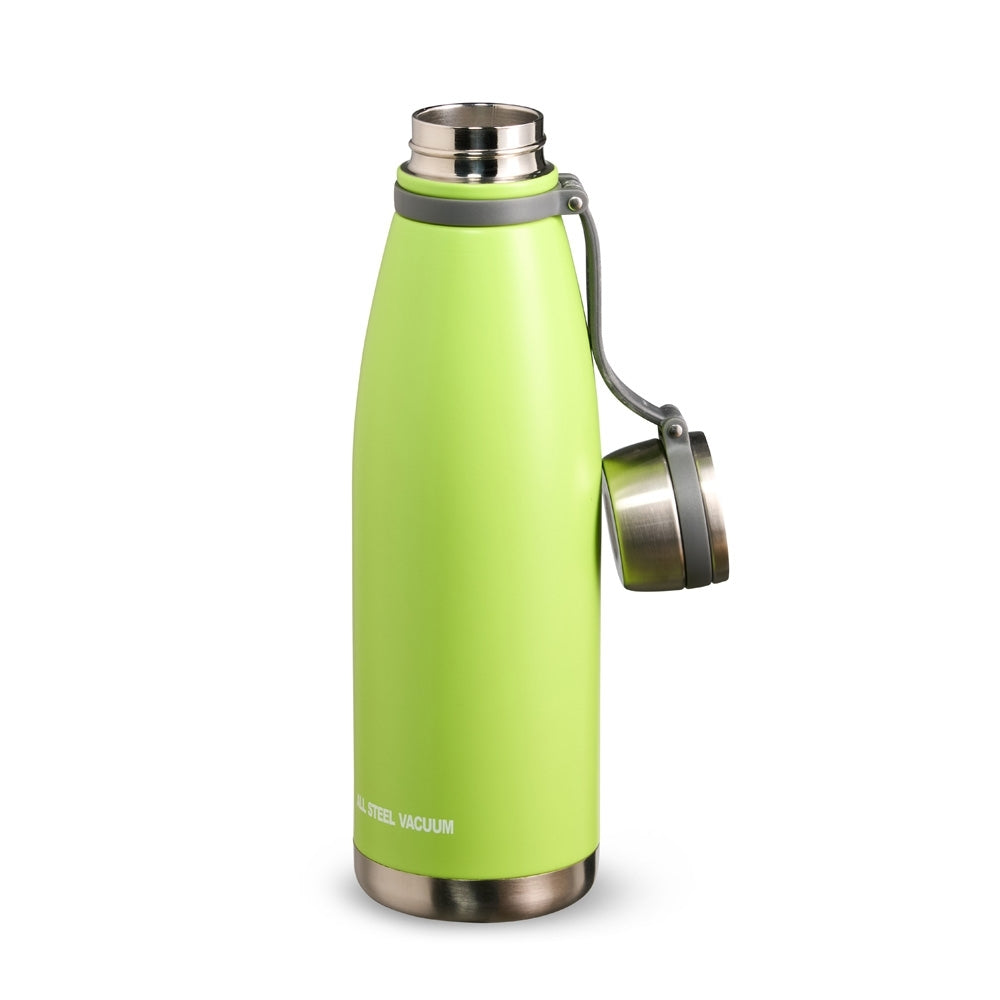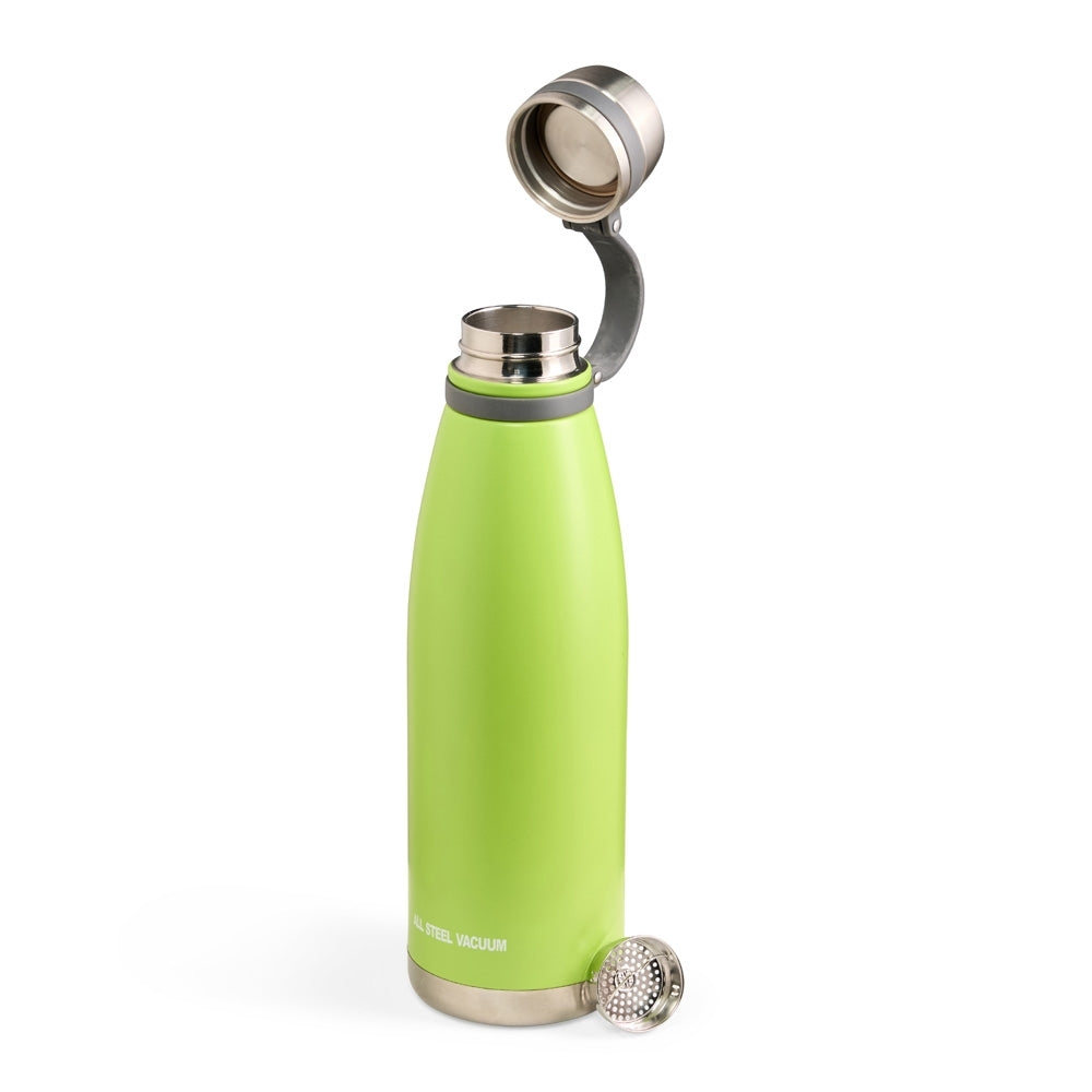 Garrafa térmica com infusor de bebidas, feita em inox 316 com capacidade de 1,1 litros e alça de silicone acoplada na tampa.