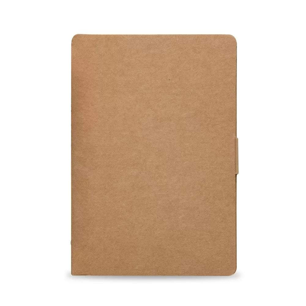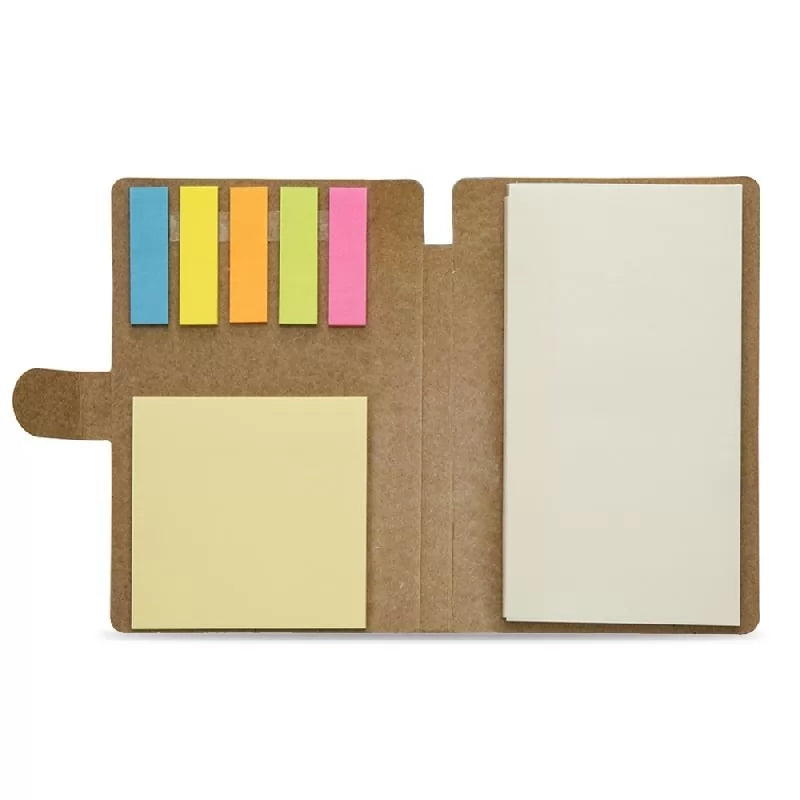 Bloco de anotações ecológico, material em kraft. Possui uma trava na própria capa, cinco blocos autoadesivos coloridos com aproximadamente 25 folhinhas , bloco autoadesivo amarelo com aproximadamente 25 folhas e bloco grande com aproximadamente 70 folhas. OBS.: IMAGEM MERAMENTE ILUSTRATIVA, não acompanha caneta!