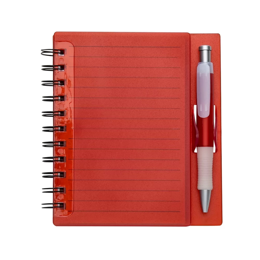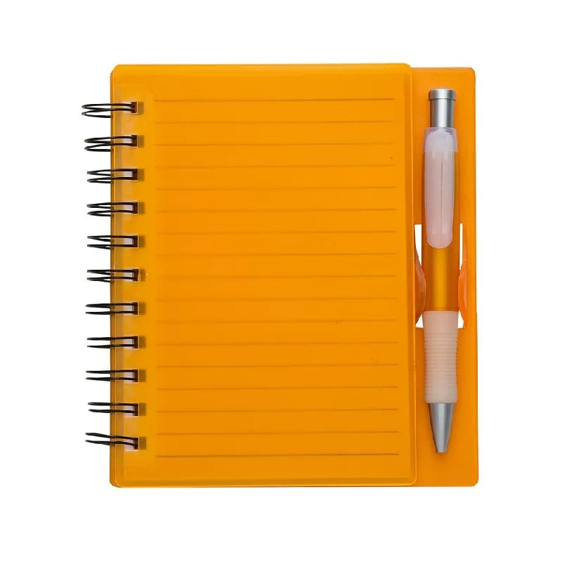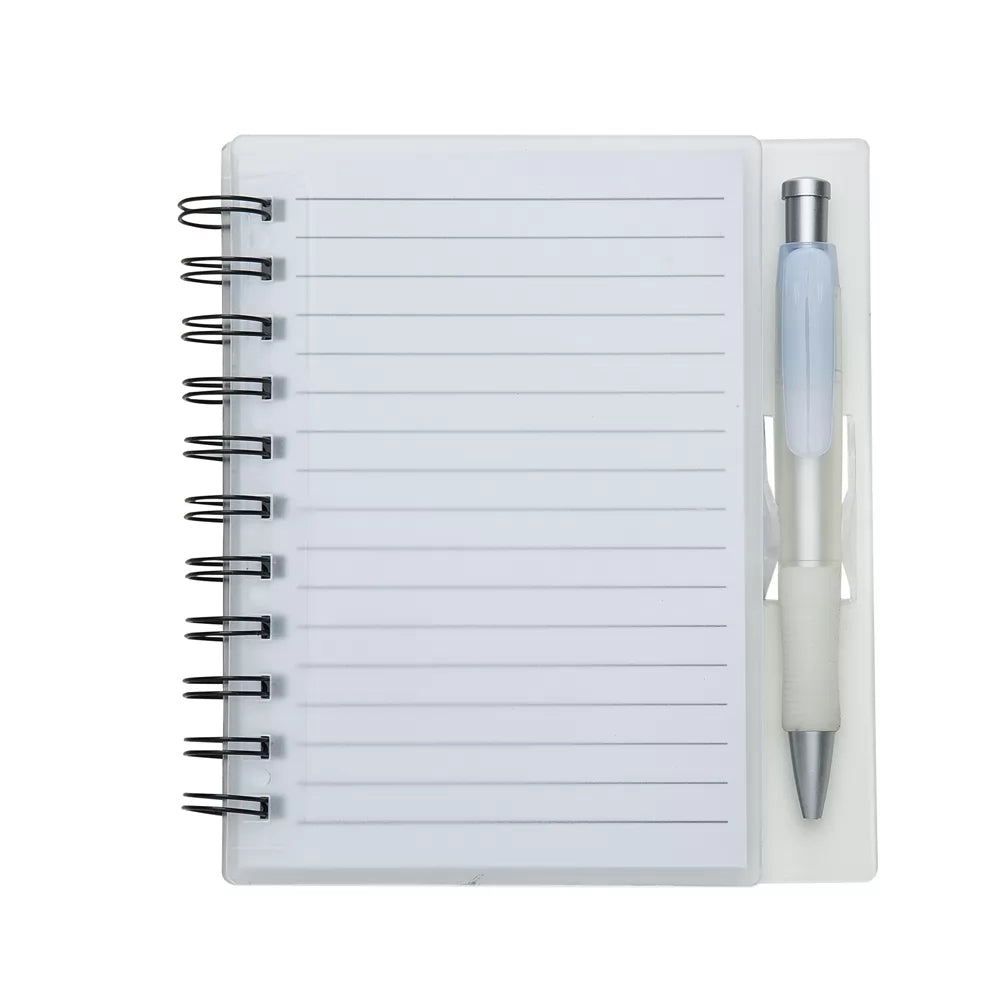 Bloco de anotações com caneta e suporte para encaixe, bloco com wire-o e caneta plástica com detalhe emborrachado, carga esferográfica na cor azul e acionamento por clique.