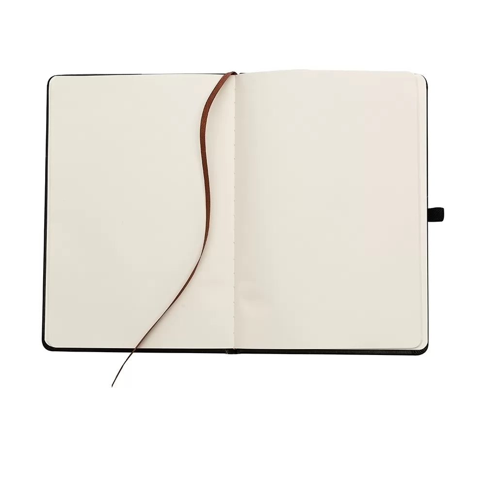 Bloco de anotações emborrachado com suporte para caneta. Contém aproximadamente 96 folhas amarelas sem pauta, suporte de nylon para caneta (não acompanha), marcador de página em cetim e elástico para lacre com plaquinha de centro emborrachado.