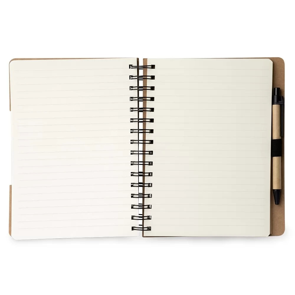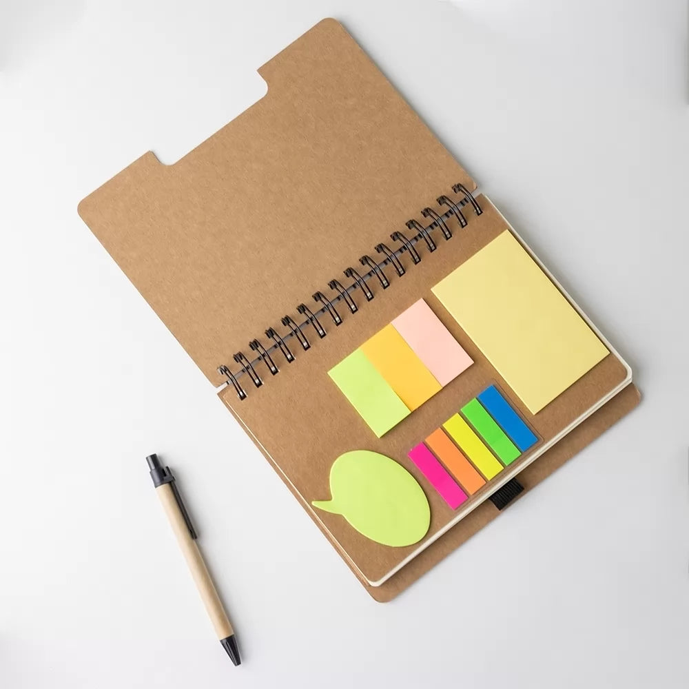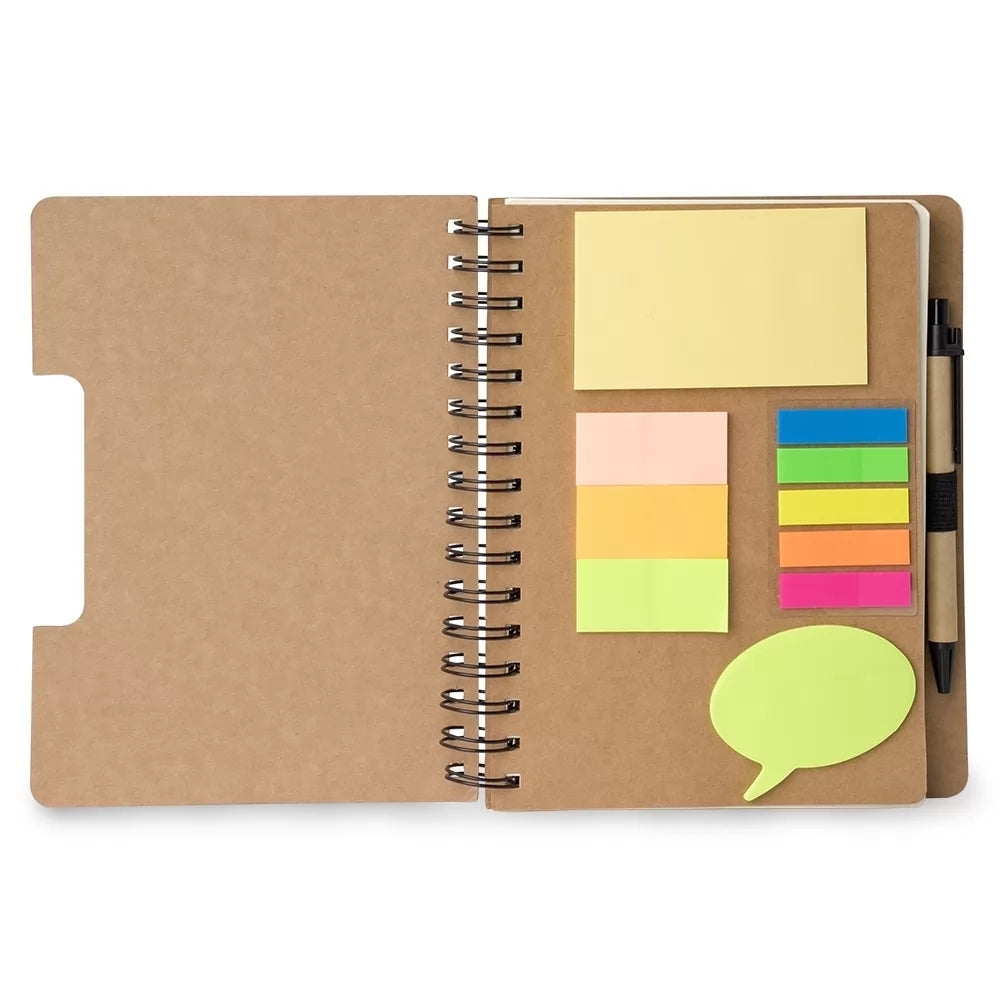 Caderneta ecológica com autoadesivos e caneta, com capa produzida em papelão kraft. Contém miolo com aproximadamente 70 folhas pautadas, suporte de nylon acompanhando, caneta de papelão com clip e ponteira de plástico com carga esferográfica 1.0mm e acionamento por clique. Bloco autoadesivo amarelo com aproximadamente 20 folhas, bloco verde com aproximadamente 20 folhas, cinco blocos coloridos autoadesivos com aproximadamente 20 folhas, 3 blocos coloridos com aproximadamente 20 folhas.