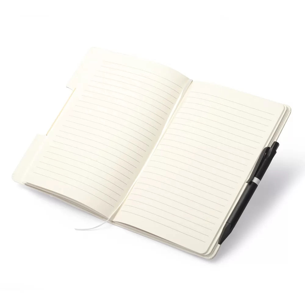 Caderno com tampa de função de suporte para smartphone. Produzido com caixa de leite, possui guarnições em bambu, porta canetas e elástico branco com 80 folhas(g/m2)pautadas na cor bege.
