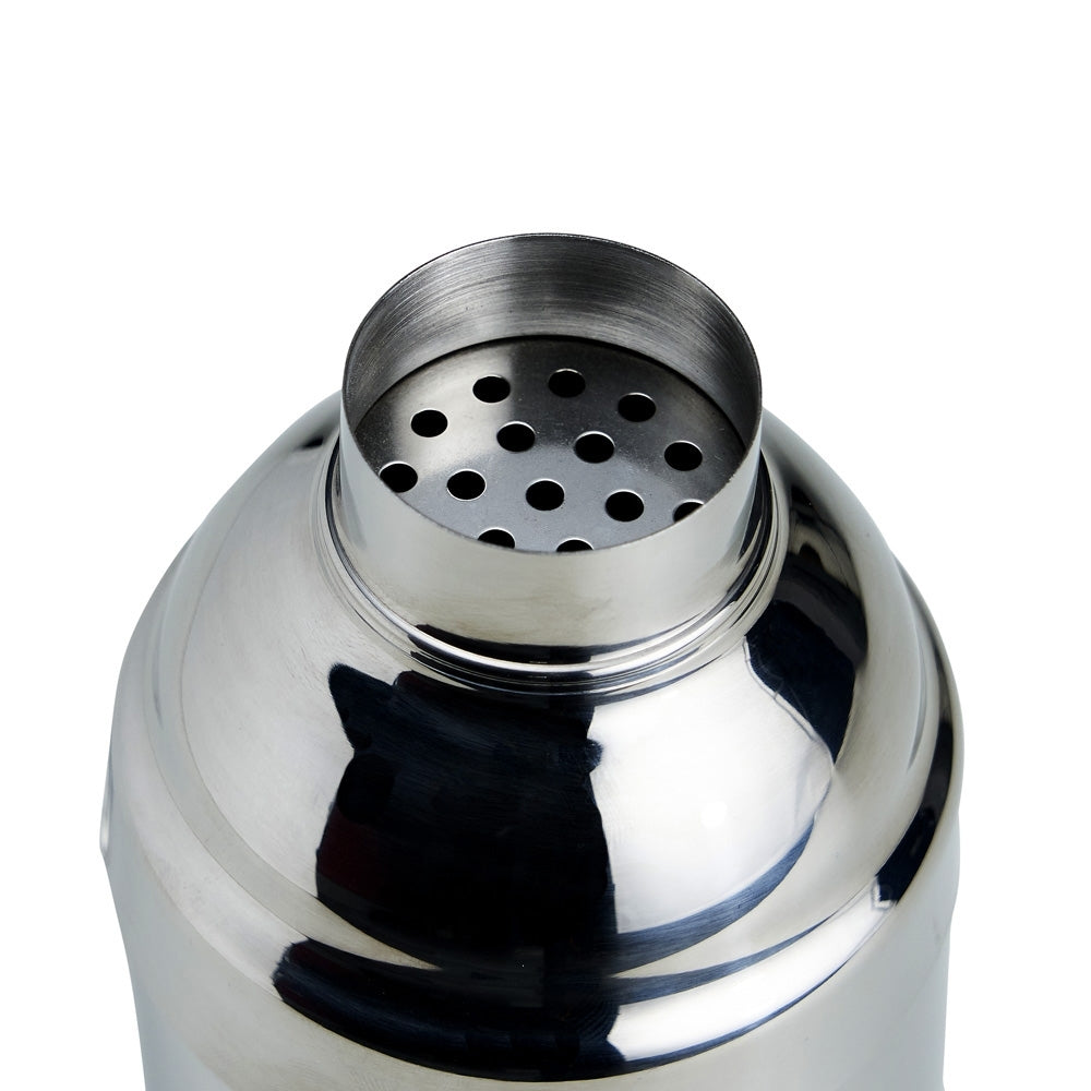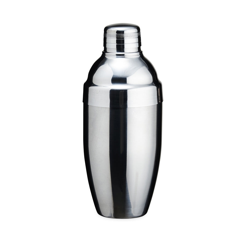 Coqueteleira de inox com capacidade para 600ml, contém tampa de pressão com peneira e tampa protetora.