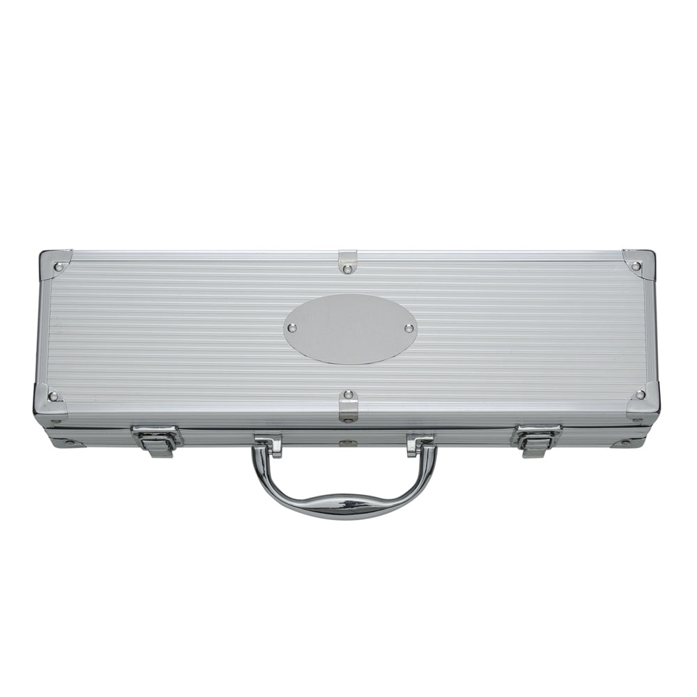 Kit churrasco 4 peças em maleta de alumínio com travas de segurança, contém: térmico, pegador, garfo e faca em inox. Parte interna da maleta com revestimento em tnt e suportes de velcro para fixação das peças.