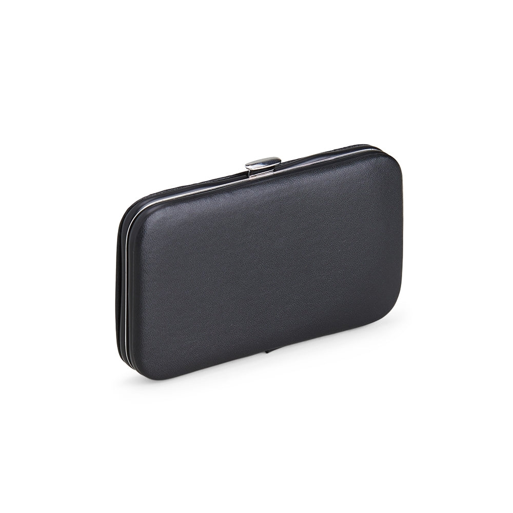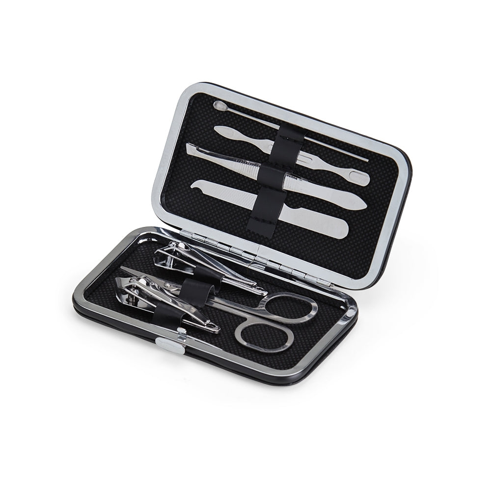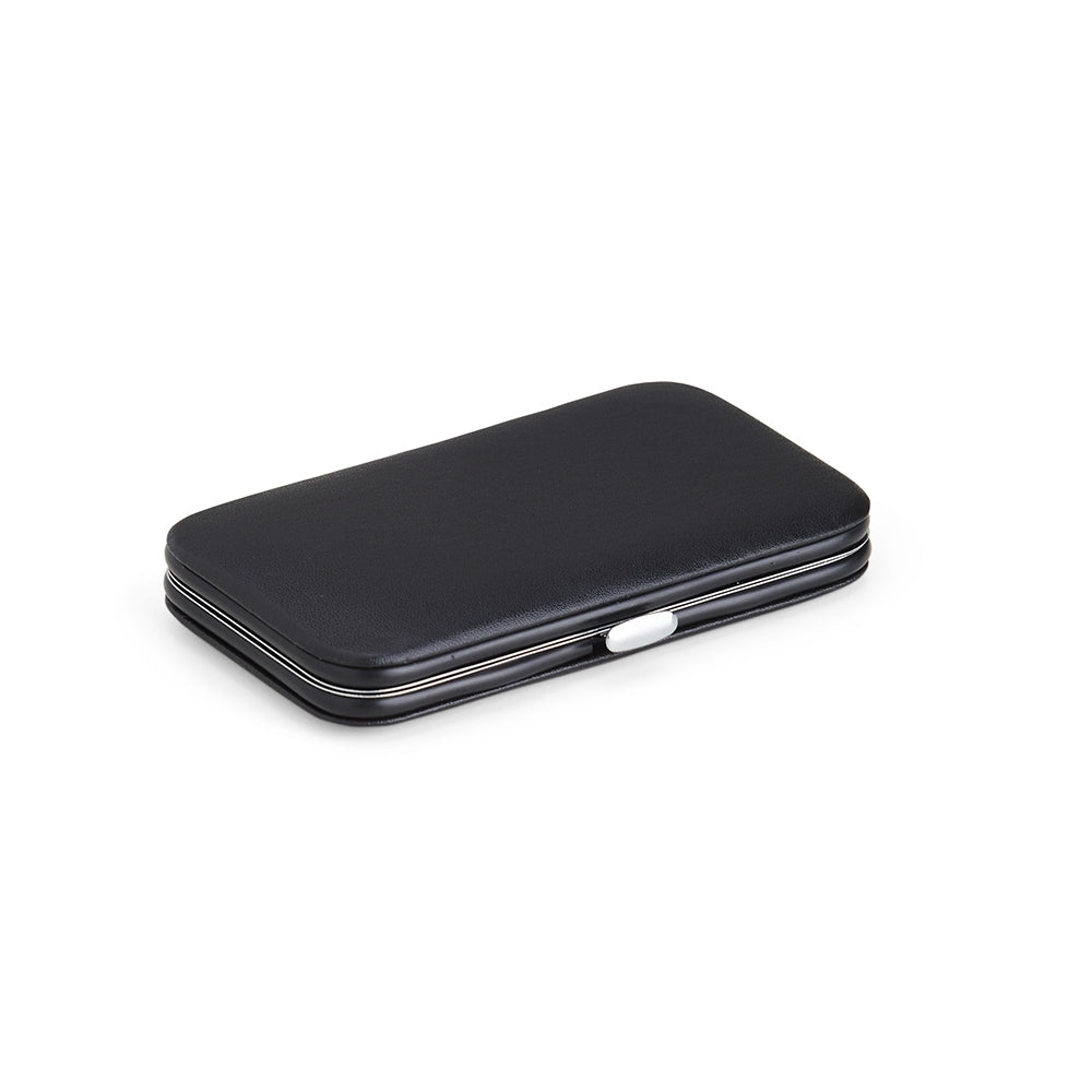 Kit manicure 7 peças em estojo de couro sintético. Possui: dois cortadores de unhas, tesoura, lixa, pinça, empurrador de cutícula e espátula para ouvido. Parte interna de TNT com suporte de couro sintético para fixar as peças. Para abrir o estojo basta apertar o botão central.