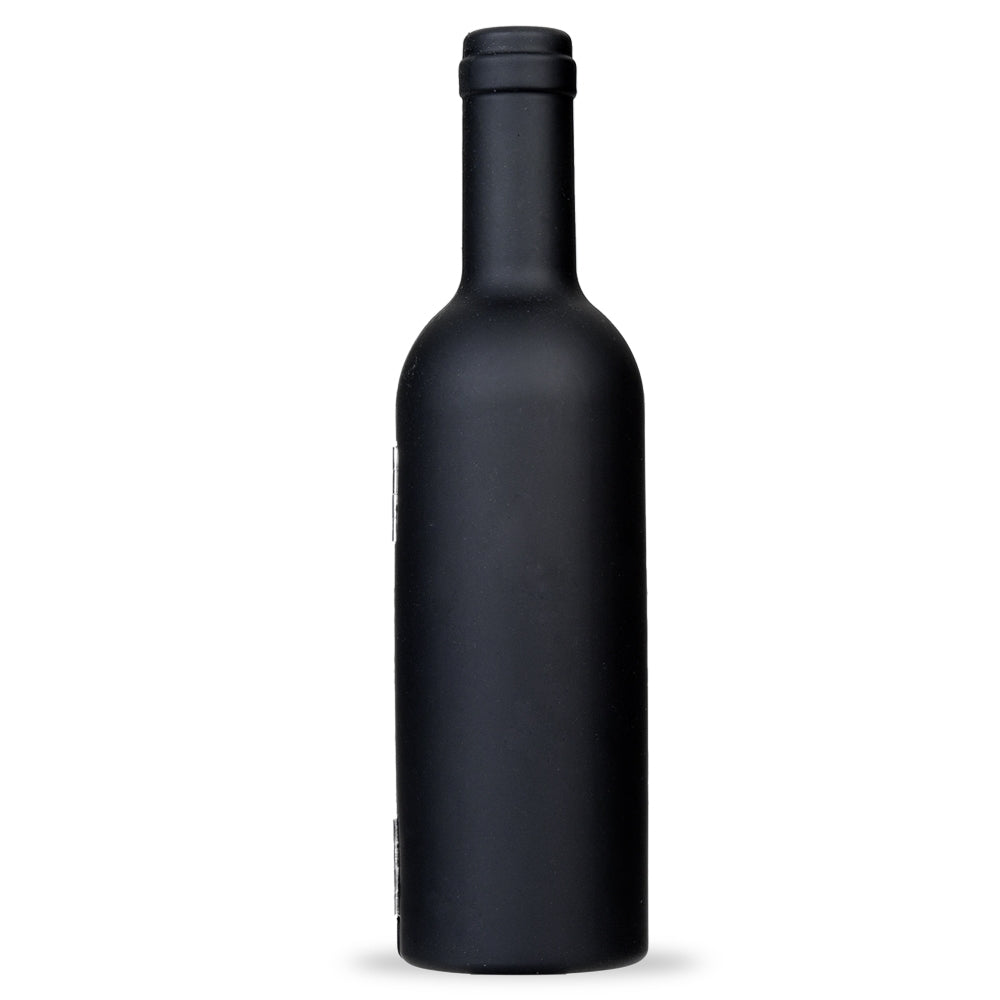 Kit vinho formato garrafa com 3 peças: wine collar, bico condutor com tampa e saca-rolhas metálico com lâmina de corte e abridor de garrafa. Estojo com fechamento imantado e área interna com berço de espuma.